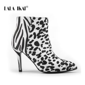 LALA IKAI Leopard Ankle Boots Women Flock Zebra Thin High Heels Short Boots Pointed Toe Party Office Shoes Woman XWC5409-4
