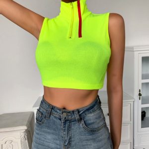 InstaHot women sleeveless t shirt crop top neon green slim zipper turn down collar casual streetwear T shirt rib knit tee