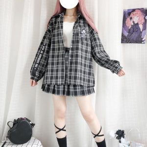 Original Pirate Rabbit Shirt Japanese Women Preppy Style Loose Black Plaid Embroidery Harajuku Bestie Blouse Lapel Spring Autumn