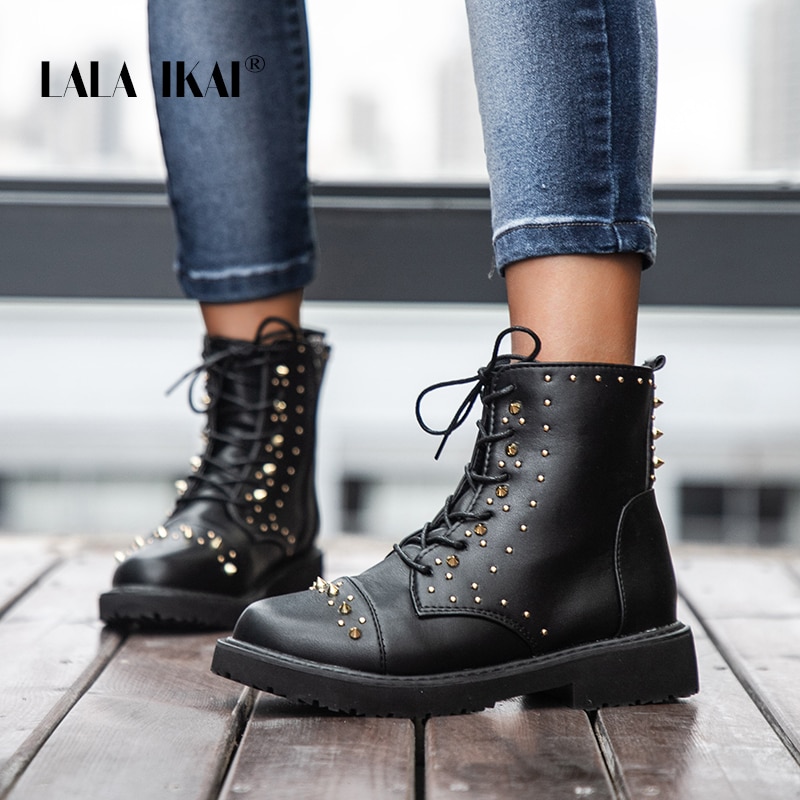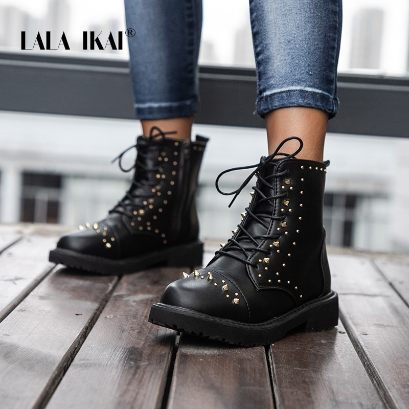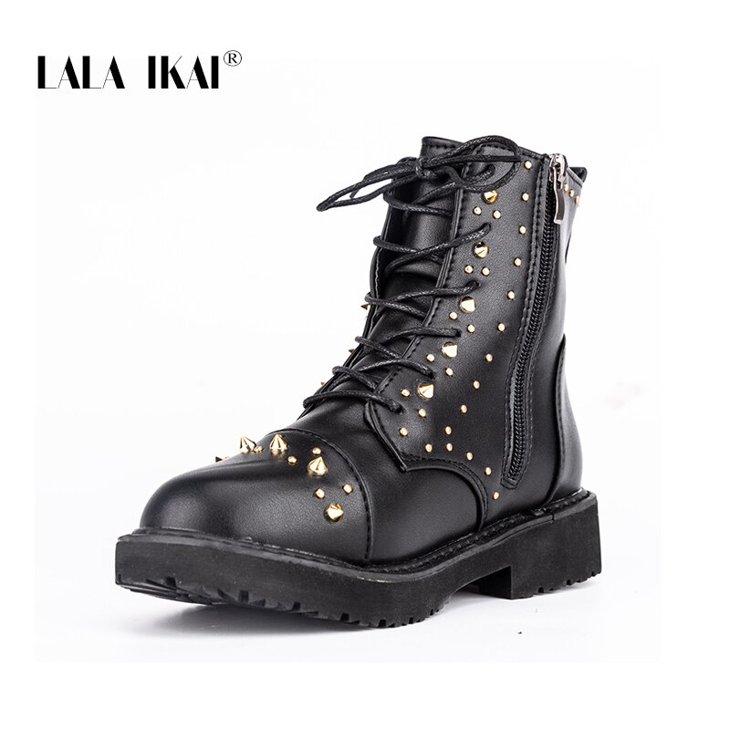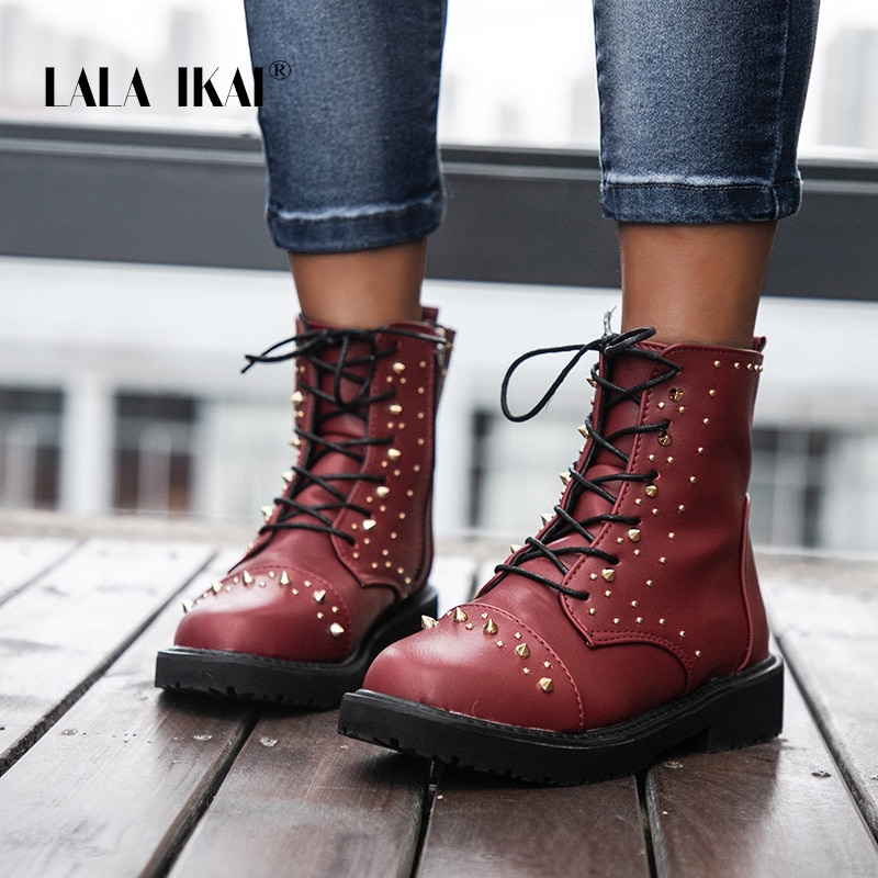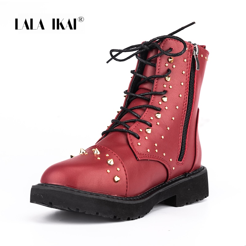 LALA IKAI Women Winter Boots Black Red Rivets Motorcycle Boots Vintage Lace-up PU Leather Female Fleece Ankle Boots XWA9671-4