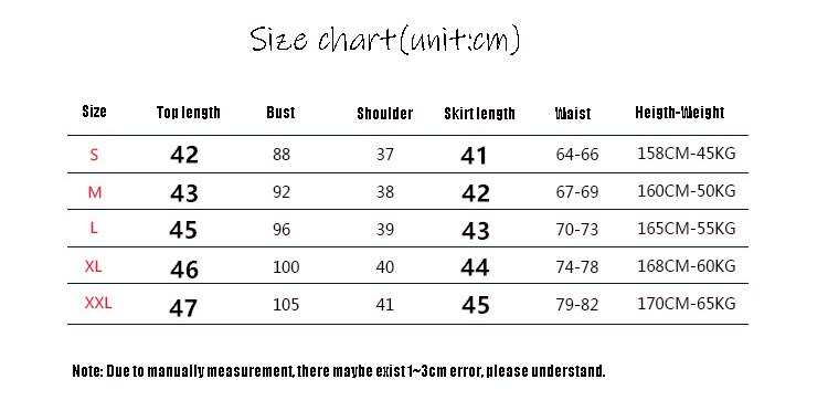- M: shoulder width 37CM, bust 91CM, length 55CM, skirt length 39CM, sleeve length 58CM, skirt waist 63-73CM