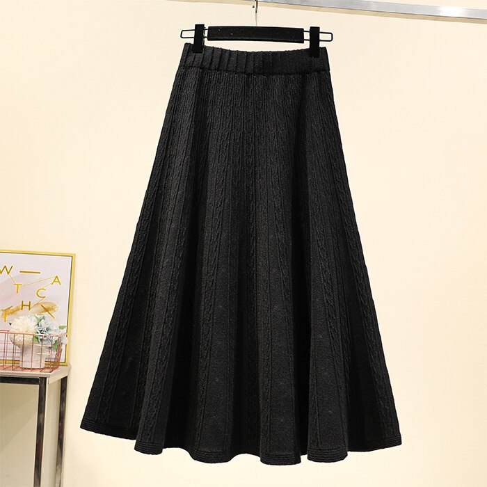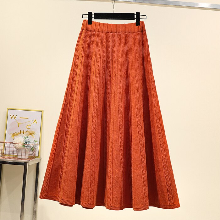 Vintage Winter Women thick sweater skirt Elastic High Waist Pleated Midi knitted Skirt female solid Plus size elegant Skirts